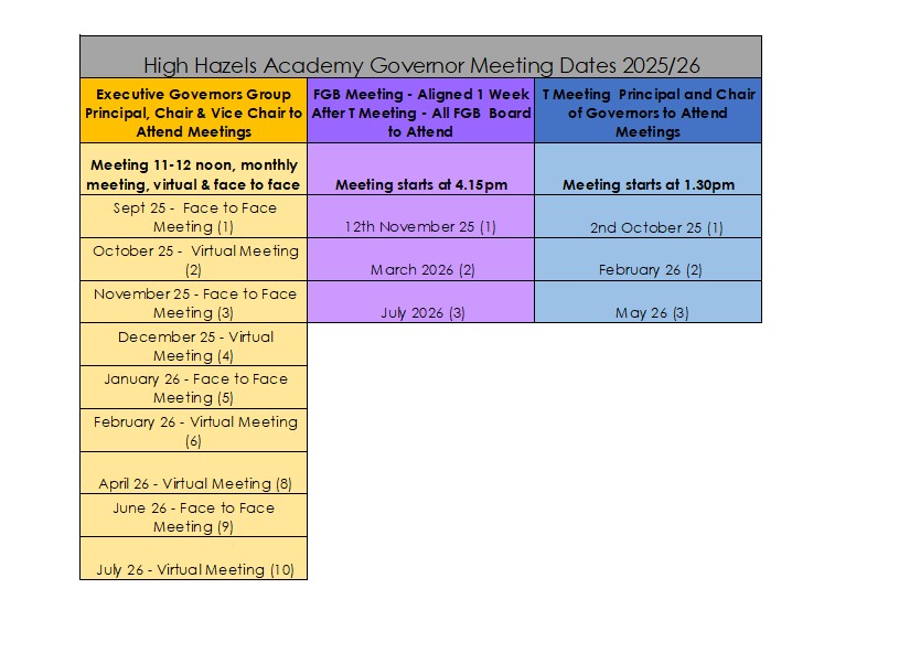 Our LGB membership was updated when we became High Hazels Academy. The LGB meets regularly and works with school leaders to monitor academic achievement and the well-being of pupils, including welfare and health and safety. It also monitors the financial management of the school and provides advice on our future direction.