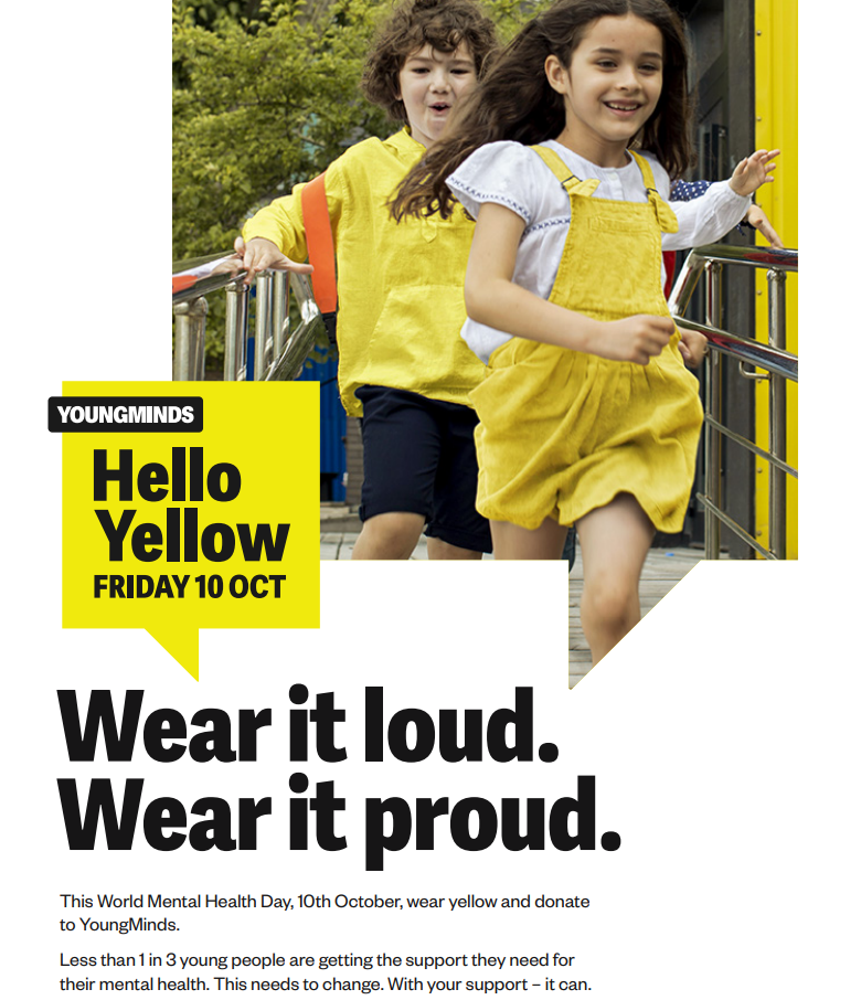 To acknowledge World Mental Health Day, we are inviting all children to attend school in something yellow on Friday 10th October 2025.