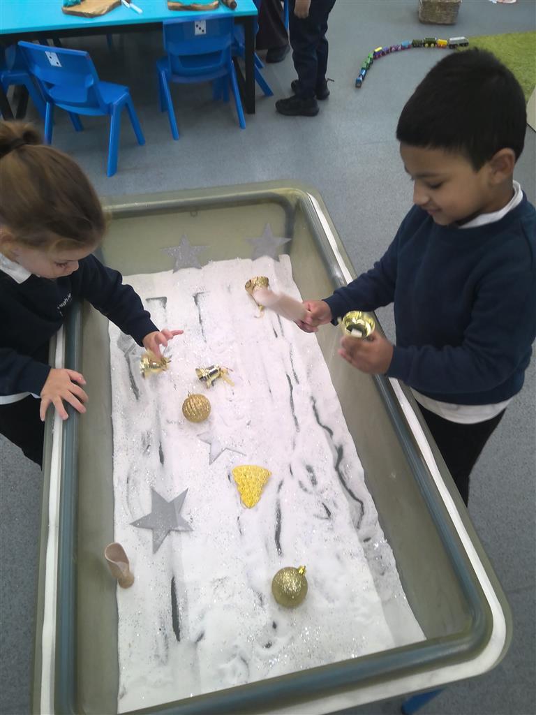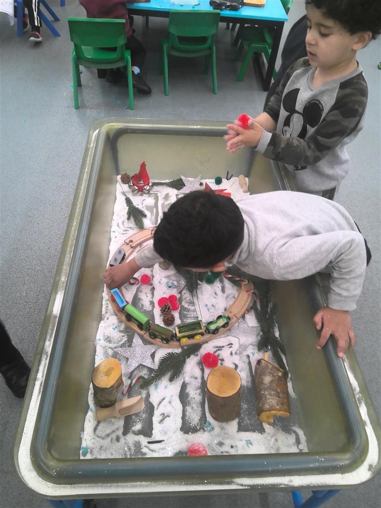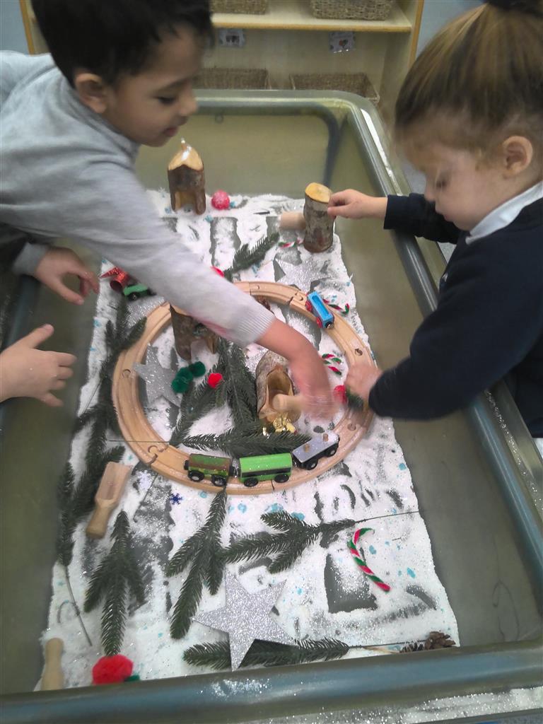 The children explored a magical winter wonderland sensory tray, filled with a train, little houses, shiny baubles, and soft “snow.” This hands-on activity encouraged imaginative play, sensory exploration, and lots of storytelling as the children discovered and created their own winter scenes.