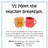 The Y1 team would like to invite Parents to a MEET THE TEACHERS BREAKFAST to give you the opportunity to share breakfast with your child and to chat with your child’s teachers.