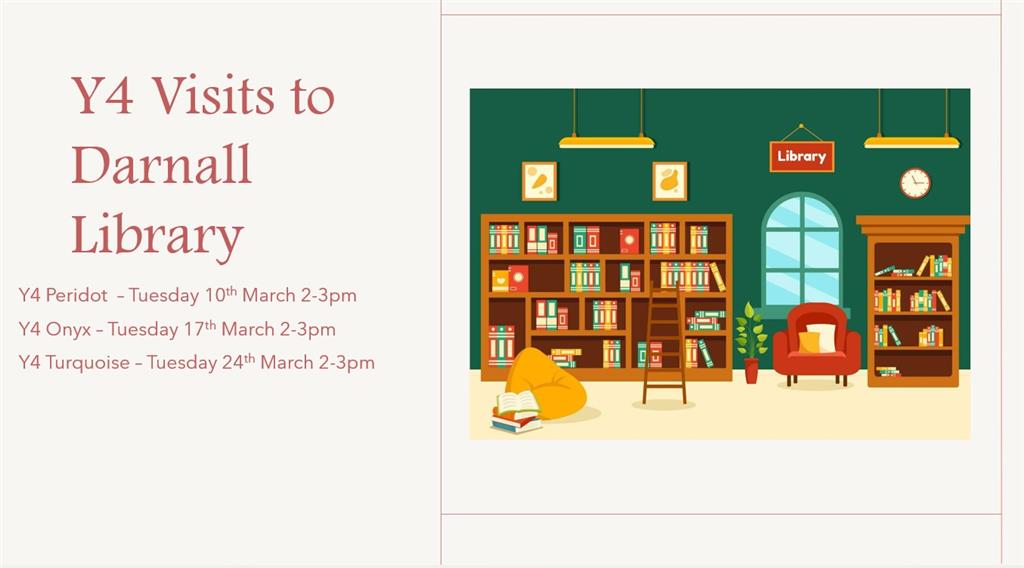 Our Y4 children will be visiting Darnall Library for a fun-filled afternoon of exploring books and listening to captivating stories! Here are the details for each class visit: