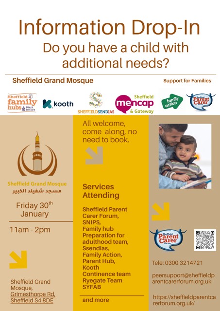 Sheffield Grand Mosque and Sheffield Parent Carer Forum are hosting a SEND support event at the Grand Mosque on Grimesthorpe Road, Sheffield, on 30 January 2026, from 11:00am–2:00pm.