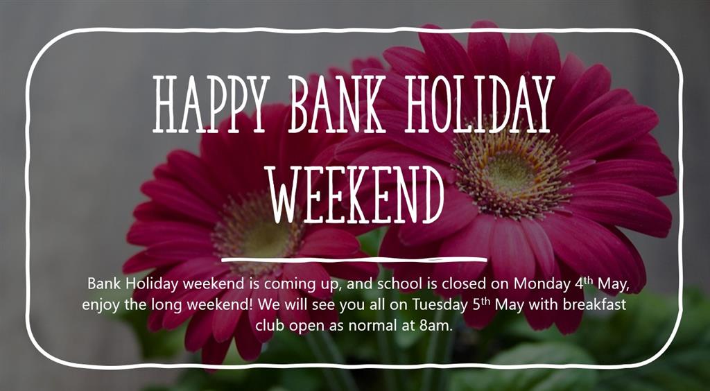 Just a quick reminder that this weekend is the May Day Bank Holiday! πŸŽ‰ Our school will be closed on Monday, 4th May, for all pupils and staff.
