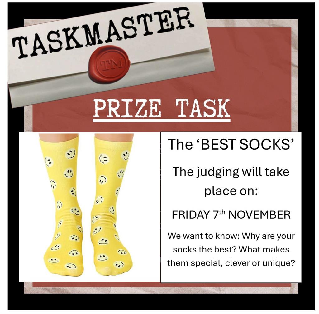 Just a friendly reminder that your next PRIZE TASK will be judged on FRIDAY 7th NOVEMBER! 🗓️ Have you designed, made, or found your 'BEST SOCKS' yet? We can't wait to see what you come up with! Get creative and have fun! 🧦✨ Don’t forget to share your sock masterpieces with us! ❤️ #BestSocks #Year6Fun